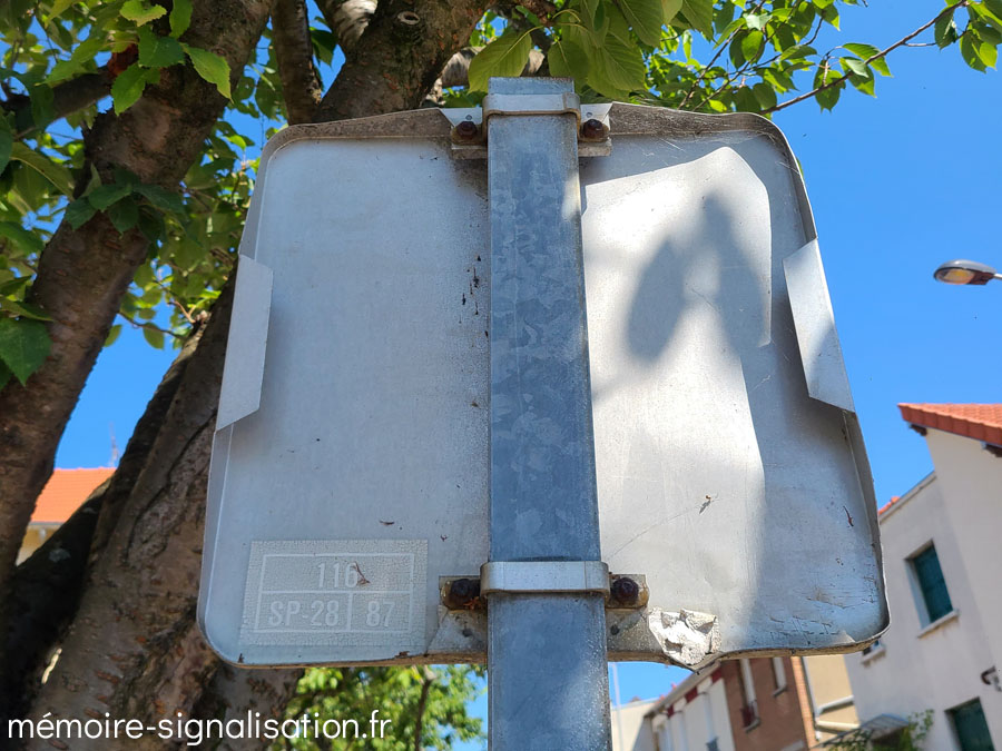 Les premiers panneaux conçus par Nadia Signalisation (certification SP 28) étaient en aluminium avec film rétroréflechissant. Ils étaient fixés par des rails arrières prenant toute la largeur du panneau avec une encoche pour l'insertion du boulon de fixation.