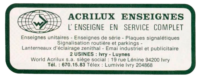 Acrilux était un fabricant d'enseignes lumineuses rétro-éclairées par tubes fluorescents et réalisées en matière plastique, fondé en 1952. Sa production d'enseignes a été déclinées pour la signalisation routière au cours des années 1970, avec la production de panneaux caissonnés rétro-éclairés de police et directionnels.