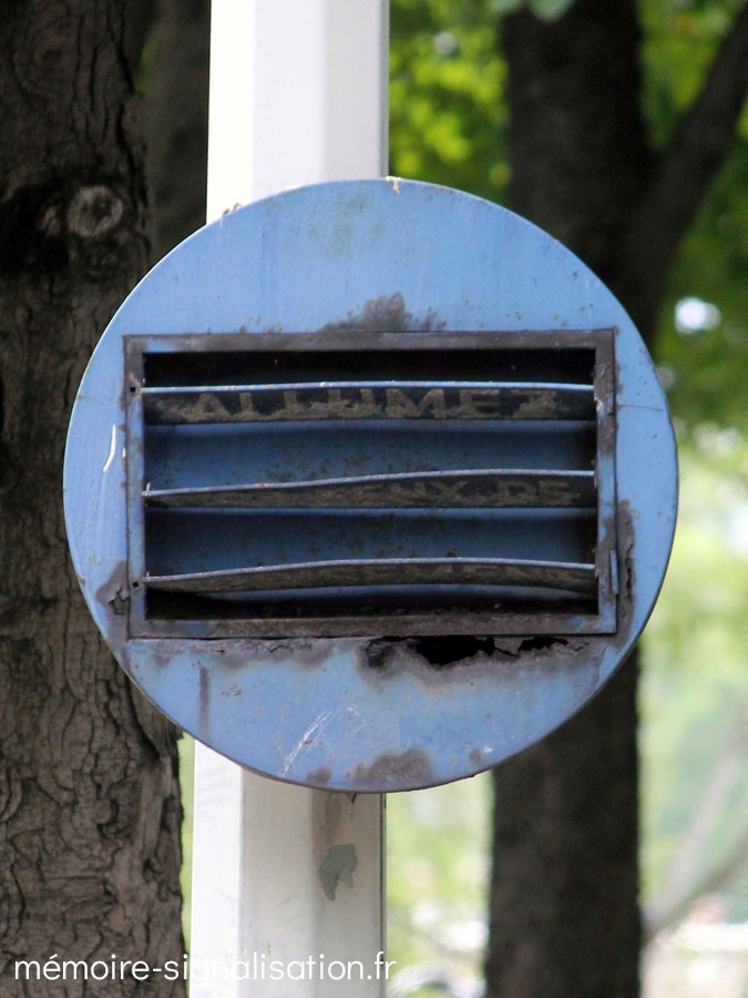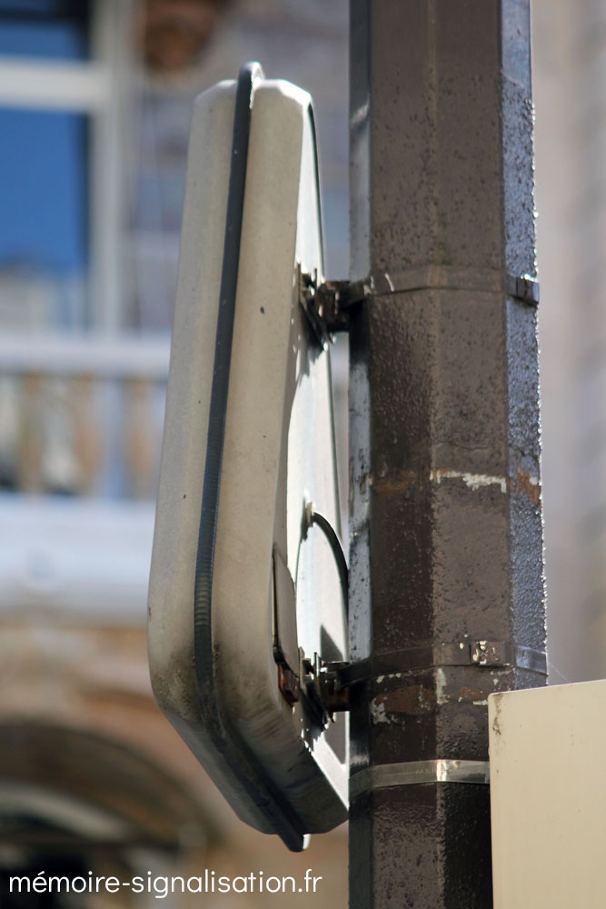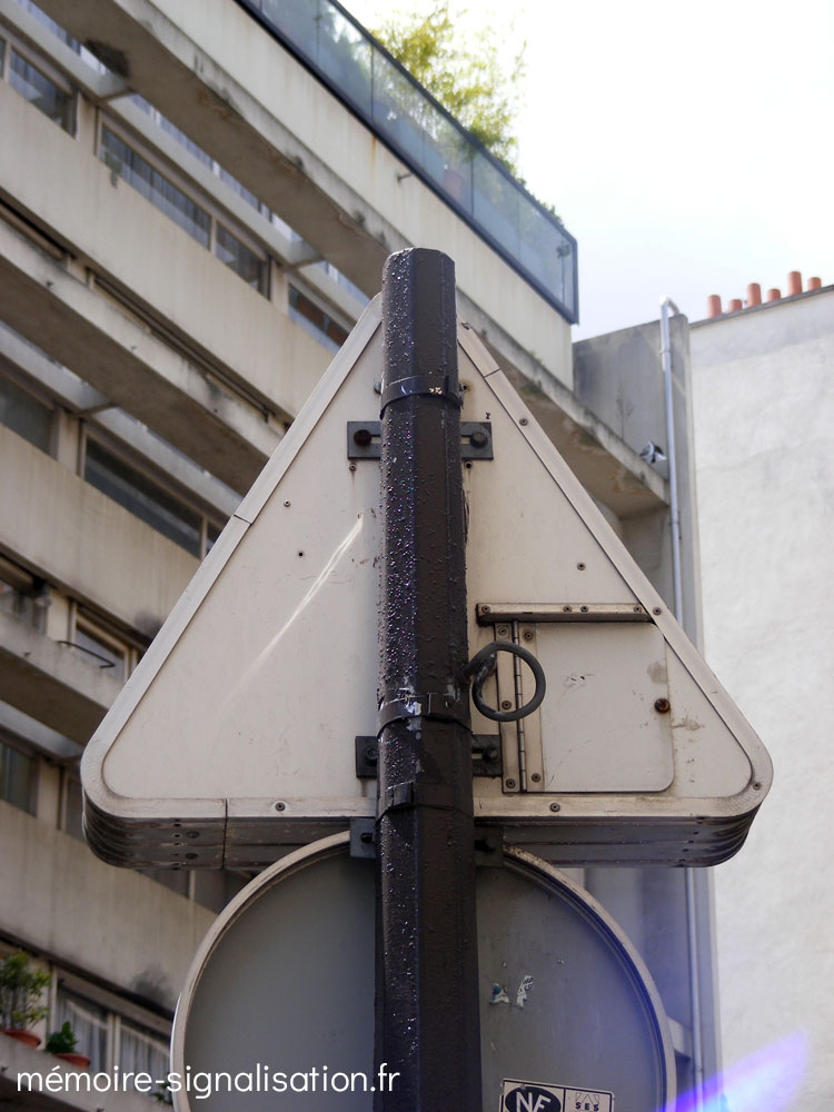 Il s'agit probablement des premiers exemplaires de panneaux de police à utiliser la technologie des prismes. Deux exemplaires étaient placés à l'entrée du tunnel de l'avenue du Maine , et un autre se situait à l'entrée du souterrain cours-la-Reine, cours Albert Ier. Installés à la fin des années 1960, ils ont tous été déposés en 2015, à l'occasion de la rénovation de l'éclairage public de ces voies. La journée, ces panneaux indiquaient autrefois l'obligation d'allumer ses feux de position, et à la nuit tombée, les 3 prismes pivotaient sur eux-mêmes et indiquaient l'obligation d'allumer ses feux de croisement. Malgré des recherches, le fabricant des ces panneaux n'a pas pu être identifié.