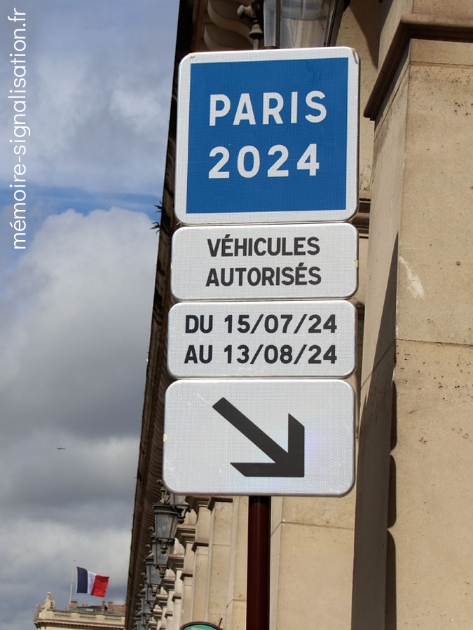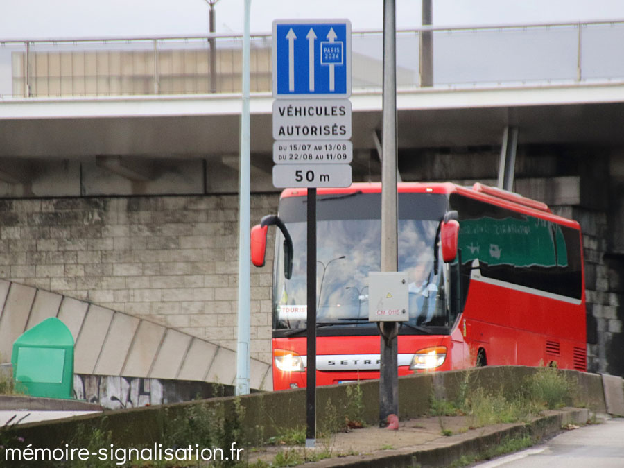 Ces panneaux à message variable (P.M.V.), conçus par Signature, ont été installés spécialement à l'occasion des Jeux Olympiques. Ils seront ré-utilisés après les J.O. pour la future voie réservée du boulevard périphérique de Paris. Ces P.M.V. sont full matrix et peuvent afficher n'importe quel symbole ou texte.
