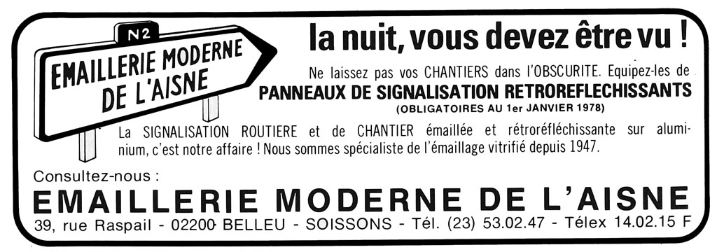 L'Émaillerie Moderne de l'Aisne (EMA) a été fondée en 1947. Elle était spécialisée dans la production d'articles en émail vitrifié dont des plaques publicitaires et des panneaux de signalisation. Dans les années 1980, l'EMA a également produit des panneaux de police en aluminium avec film rétroréflechissant. Elle a été placée en liquidation judiciaire en février 1999.
