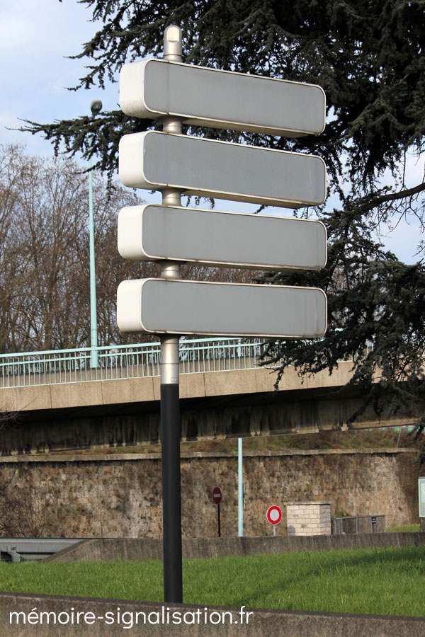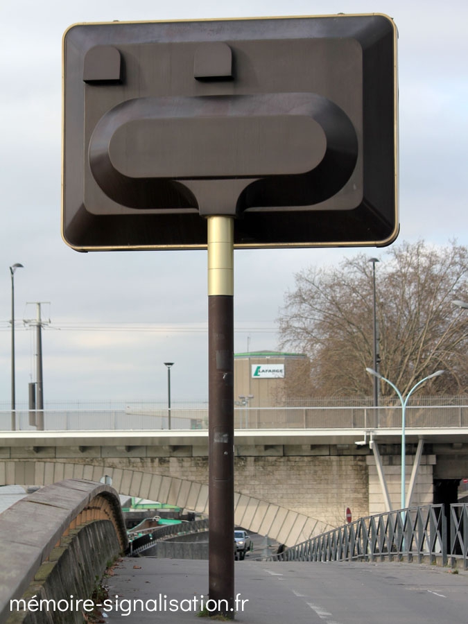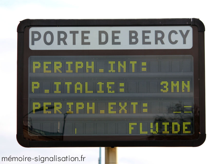 • Une version plus élaborée comportant le sens de circulation (intérieur ou extérieur) ainsi que le nom de la porte d'accès, 4 prismes en partie centrale permettant d'afficher un panneau de police, deux feux d'alerte et 3 lignes de 15 caractères. Ce modèle est placé à l'entrée des accès au périphérique.