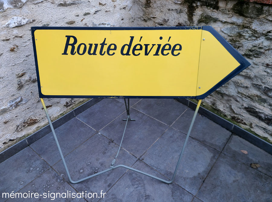 Picardie Signalisation a fabriqué des panneaux temporaires montés sur un châssis métallique dépliable qui se bloque grâce à une barre transversale. Les panneaux directionnels avaient une pointe de flèche amovible et orientable vers la gauche ou la droite.