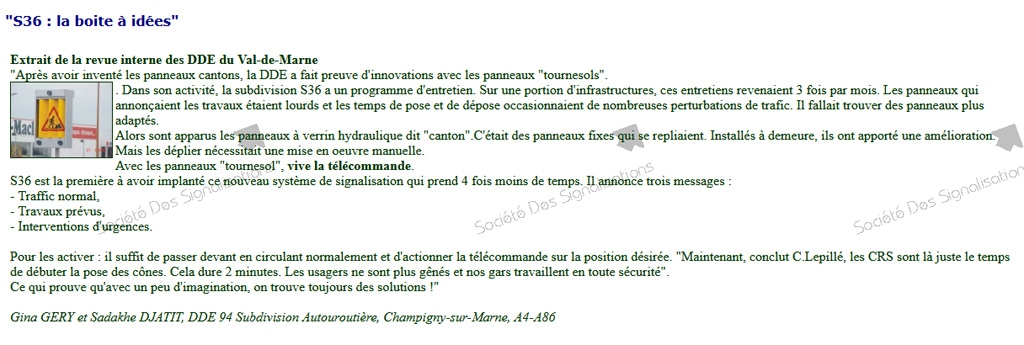 Les panneaux Tournesol ont été mis au point en 2002, sur une idée de la subdivision S36 de Champigny-sur-Marne de la DDE 94. Ces panneaux télécommandés et autonomes en énergie grâce à leur panneau solaire étaient installés sur le terre plein central (TPC) et permettaient d'éviter les manipulations dangereuses de signalisation sur l'A4 et l'A86, deux autoroutes d'Ile-de-France au trafic très important. Ils avaient trois positions : neutre, intervention d'urgence (symbole AK14), et chantier prévu (symbole AK5). Les derniers exemplaires de l'A86 ont été déposés en 2020, et des panneaux manuels ont été réinstallés... D'autres exemplaires plus petits à deux prismes ont été installés sur l'A7 et l'A9 pour le compte des ASF.