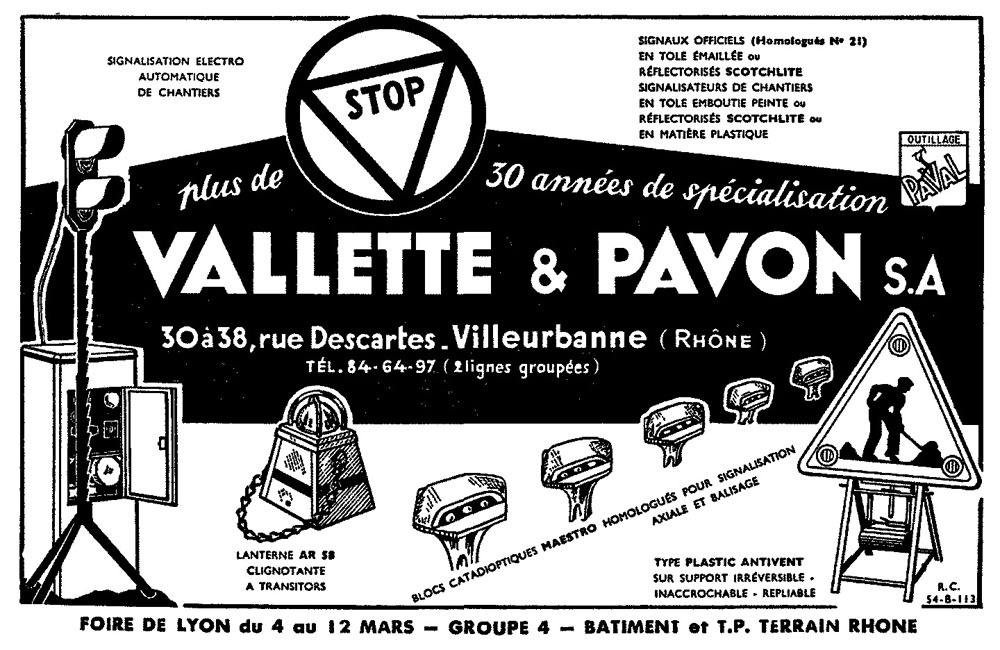 Les établissements Vallette et Pavon sont fondés en 1931 à Lyon. Ils étaient spécialisés dans la fabrication d'outillage et de matériel pour les chantiers du bâtiment et de la route. À partir des années 1950, Vallette et Pavon lance la marque Signaux Paval et débute la fabrication de panneaux de signalisation routière permanents et de chantier, et a été agréée par le ministère des travaux publics en 1950. Ils ont également été le distributeur des panneaux en mosaïque de verre Matray.